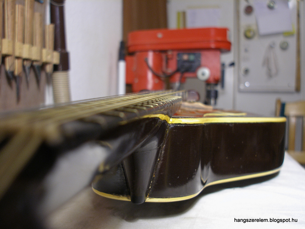 Elsőként a test felsőtőke-felőli végét kellett rendbetenni. A kávalemezek is felváltak egyes helyeken, és ahogy már korábban is említettem, a tető is elvált a felsőtőkétől, ezt csak tessék-lássék módon orvosolták. Egy komoly tisztogatás, és a lemezek visszaragasztása után jöhetett a nyaktő rendbetétele. Először ezt is megtisztítottam a ragasztótól, majd a makkot visszaragasztottam a nyakszárra. A nyaktövet két oldalról keményfa toldásokkal láttam el, amelyek a fecskefarkas csapolás részét képezik. Ezek teszik lehetővé, hogy a nyak szárazon is stabilan álljon. Ha a csapolás szárazon nem tudná megtartani a húrokat, akkor nem is igazán jó, ragasztót voltaképpen csak azért használunk, hogy a rezgések miatt ne tudjon kirázódni a nyaktő a helyéről.